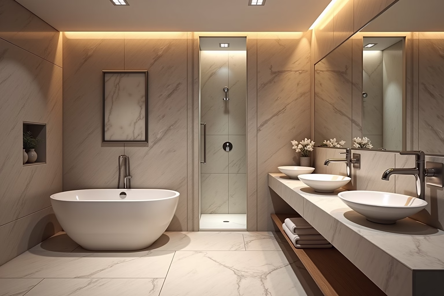 Tipp: Kombiniere Marmorfliesen mit goldenen Armaturen und Accessoires, um den luxuriösen Look zu unterstreichen. Eine freistehende Badewanne und eine großzügige Dusche machen das Marmorbad perfekt.