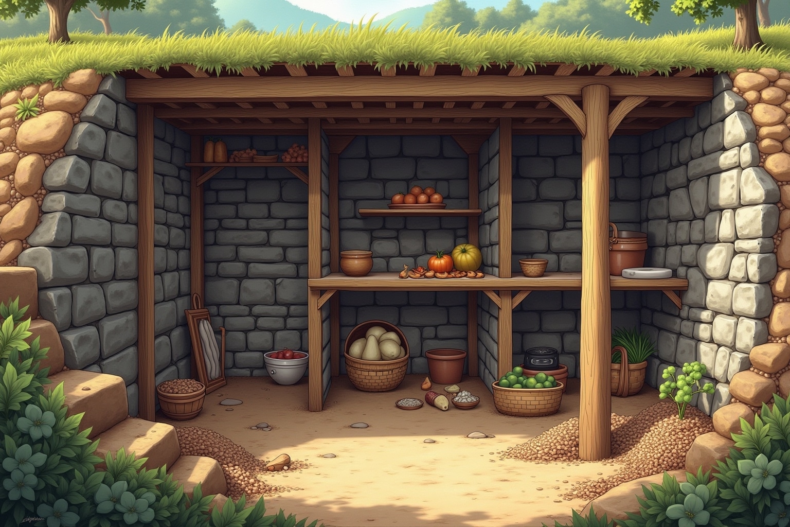 Ein Erdkeller nutzt die konstante Temperatur des Erdreichs, um eine natürliche Kühlung zu gewährleisten. Diese Umgebung eignet sich hervorragend zur Lagerung von Obst, Gemüse, Wurzelgemüse, aber auch von Konserven und Wein. Die ideale Temperatur liegt meist zwischen 4°C und 10°C, die Luftfeuchtigkeit sollte hoch sein, um Austrocknung zu verhindern.