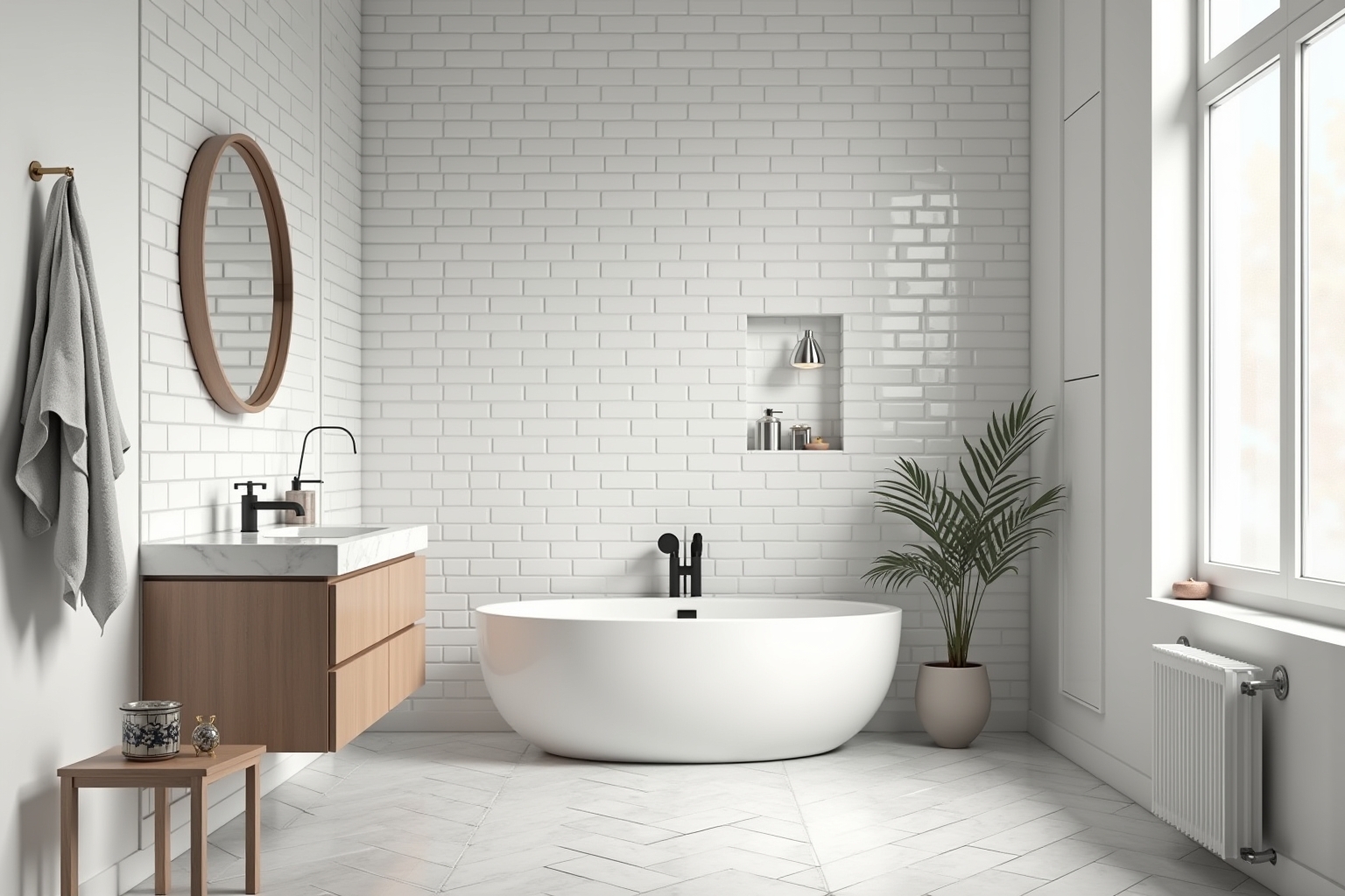 - Glänzende Oberflächen: Hochglänzende Fliesen oder Oberflächen reflektieren das Licht und lassen den Raum heller und größer wirken.