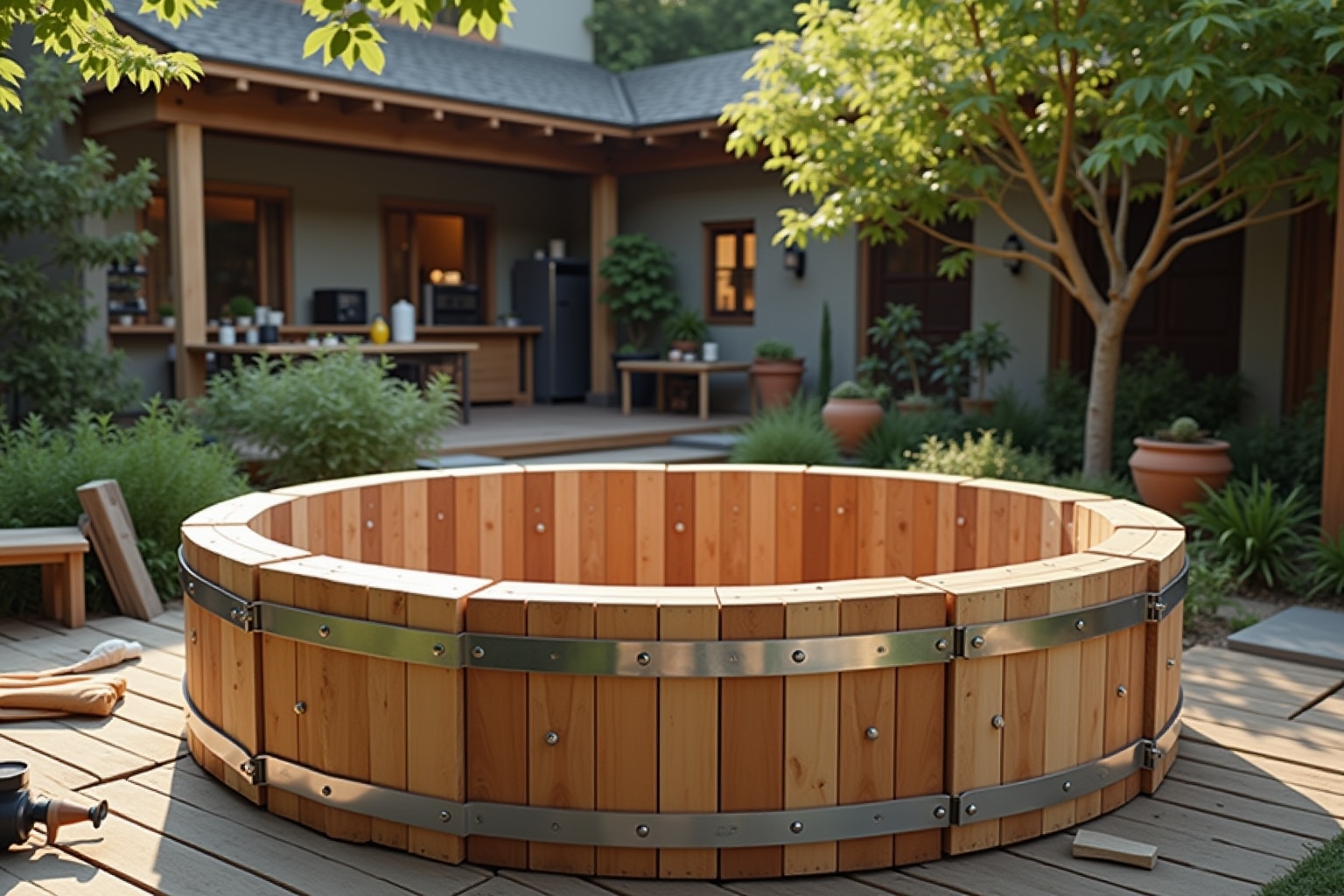 - Holzfass-Konstruktion: Dies ist eine traditionelle und beliebte Methode. Dabei werden Holzbohlen (Dauben) zu einem zylindrischen oder polygonalen Becken zusammengefügt und mit Spannbändern gesichert. Wichtig ist die Verwendung von Hartholz, das Feuchtigkeit gut verträgt und wenig quillt oder schwindet. Alternativ kann ein vorgefertigter Innentank aus Polyethylen oder GFK (glasfaserverstärkter Kunststoff) verwendet werden, der dann von außen mit Holz verkleidet wird.