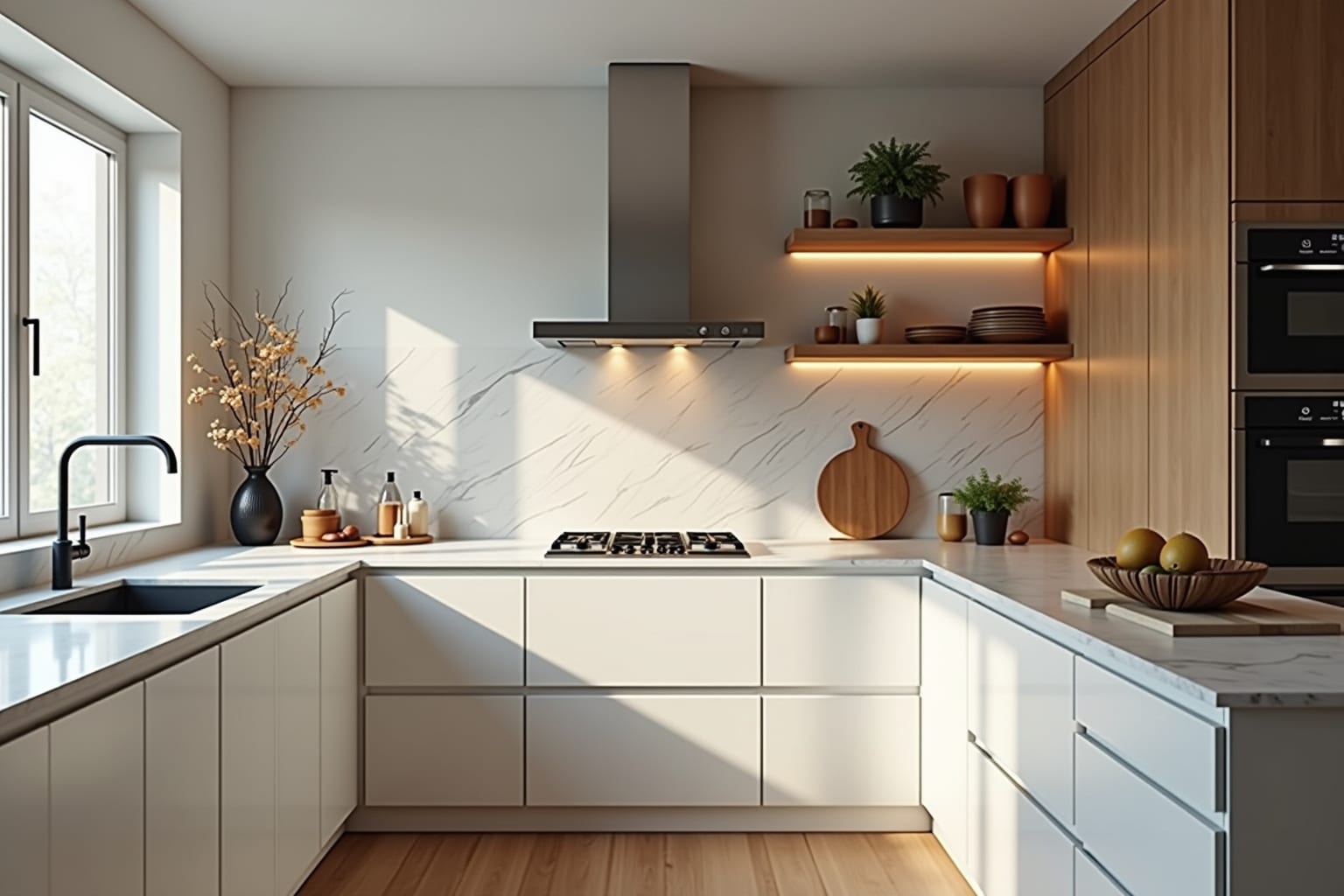 Offene Regale sind eine tolle Möglichkeit, deine Küche zu dekorieren und gleichzeitig zusätzlichen Stauraum zu schaffen. Du kannst dort Geschirr, Gläser, Kochbücher oder dekorative Gegenstände präsentieren. Offene Regale verleihen deiner Küche einen individuellen Touch und machen sie zu einem Hingucker.